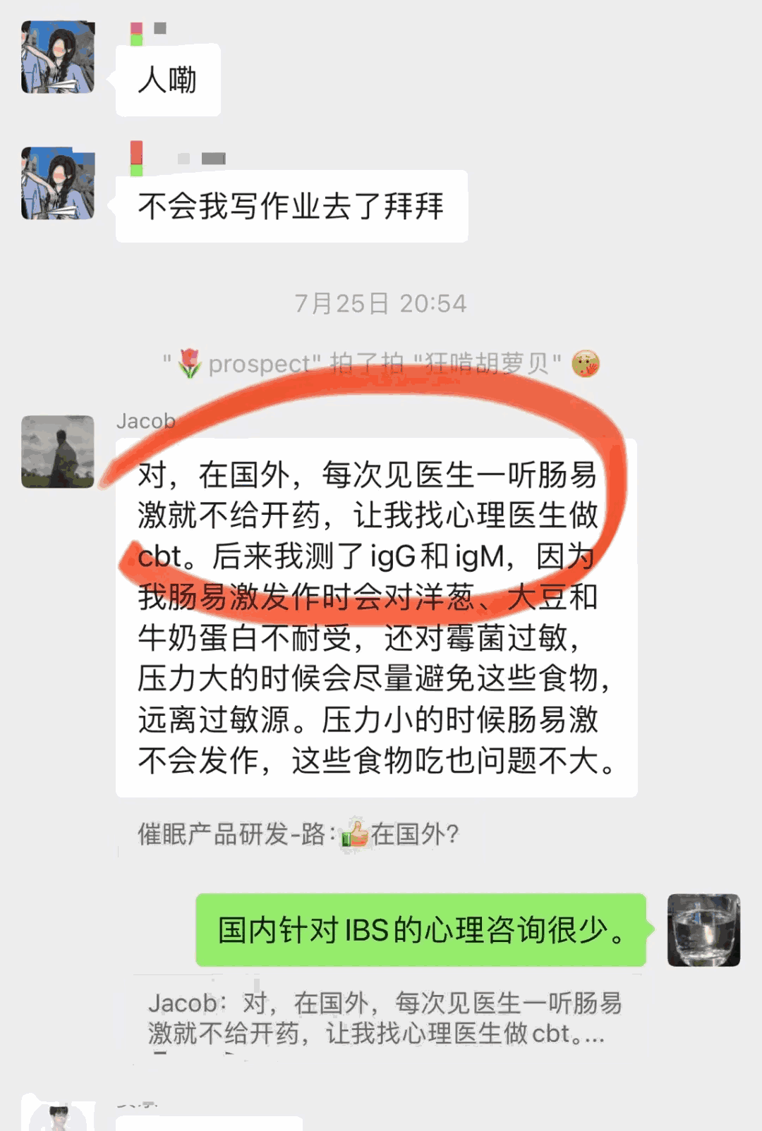 最近访谈了一位病友,留学剑桥的Jacob博士,他和肠易激综合征(IBS)斗争了11年。访谈起因是他在肠安心的病友群里说了一句:在国外,每次见医生一听肠易激就不给开药,让我找心理医生做CBT。