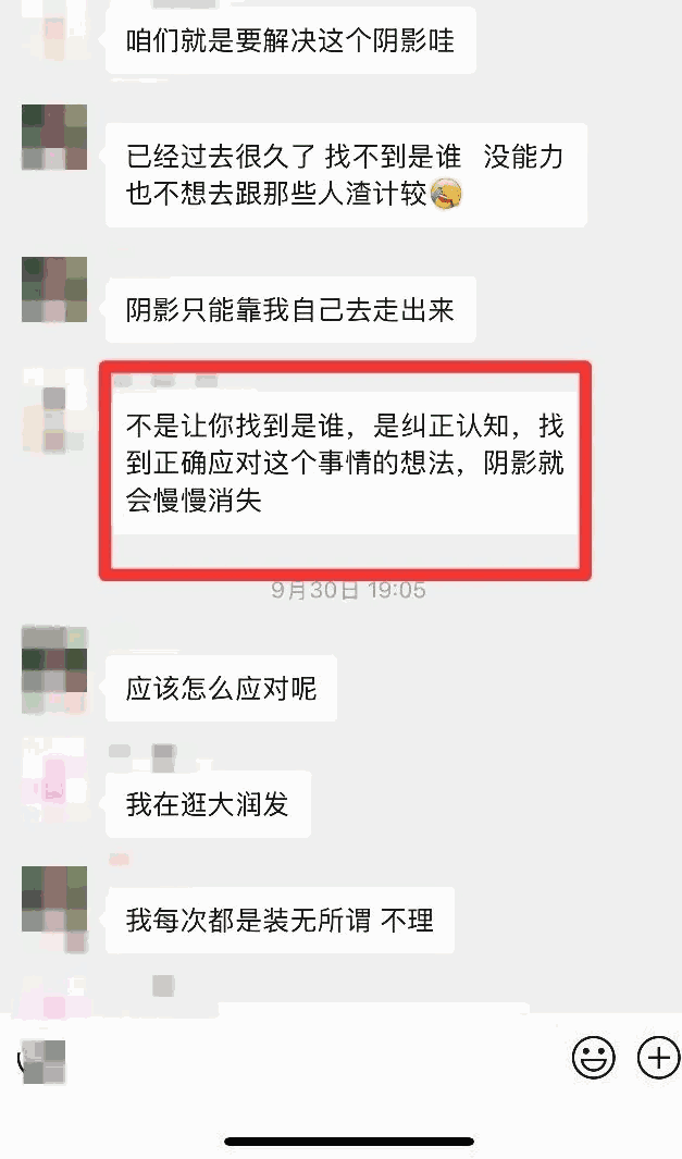 当局者迷,身处困境中自己很难识别到负面思维,所以小花也在群里多次提过:有条件去尝试下认知行为疗法。